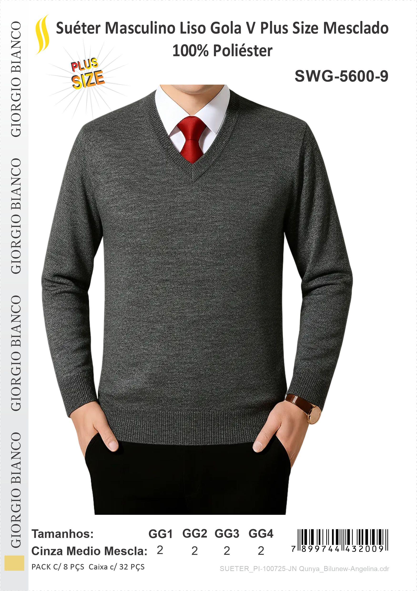 SUETER MASC 100%POL LISO GOLA V PLUS SIZE MESCLA CZA MEDIO