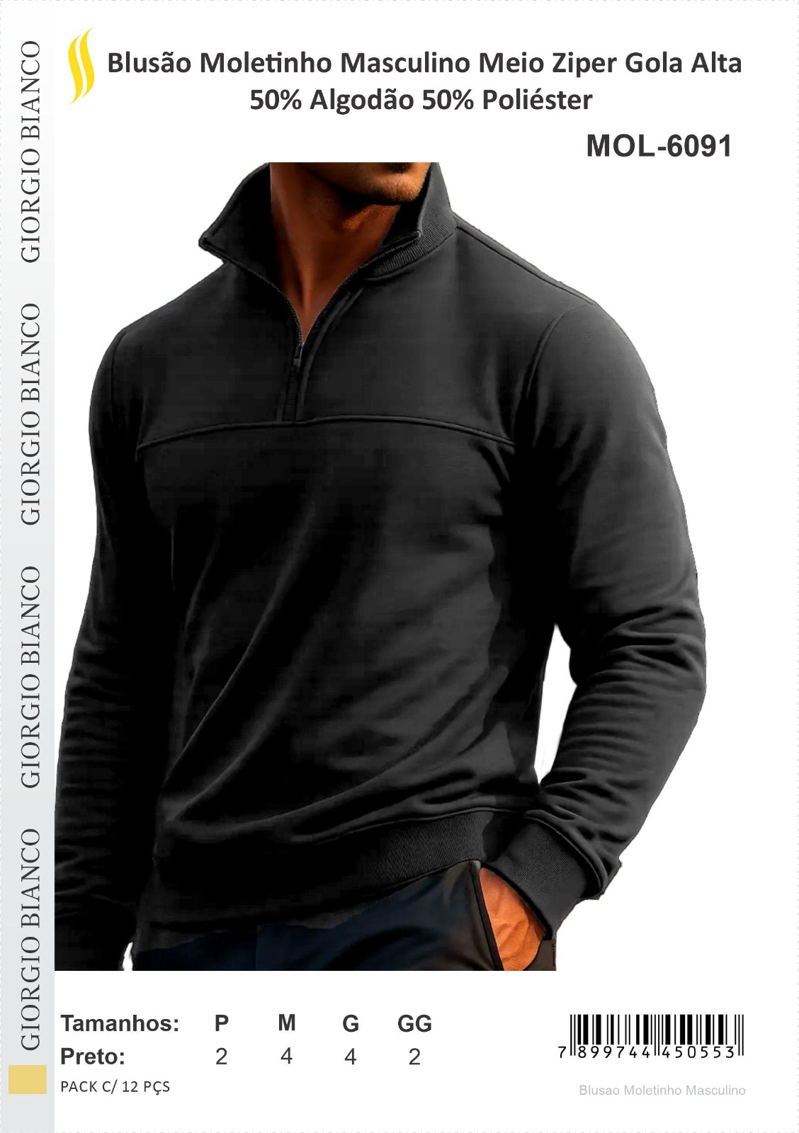 BLUSAO MASC MOLETEINHO 50%POL 50%ALG G. ALTA MEIO ZIPER PTO