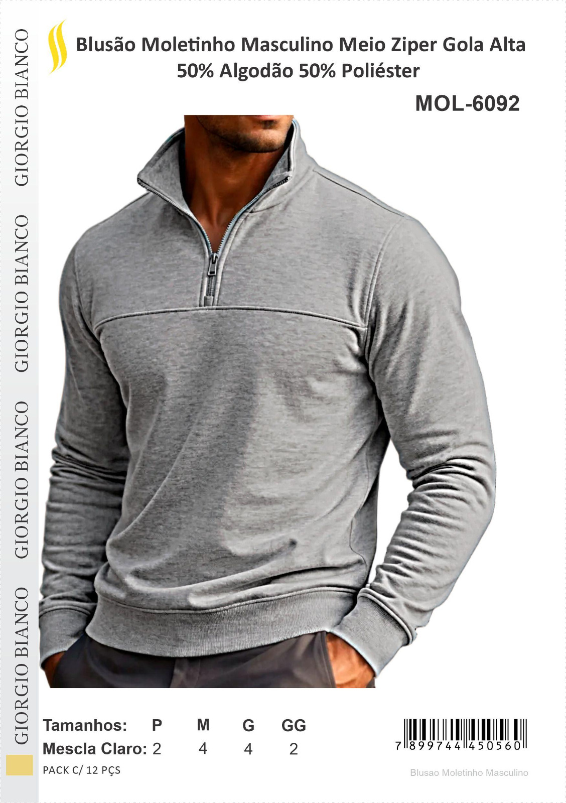 BLUSAO MOLETINHO MASC 50%POL 50%ALG G. ALTA MEIO ZIPER CINZA