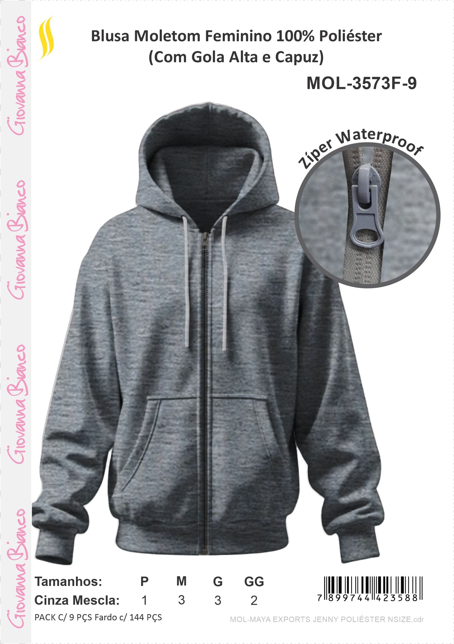 MOLETOM FEM 100%POL GOLA ALTA C/CAPUZ CINZA MESCLA