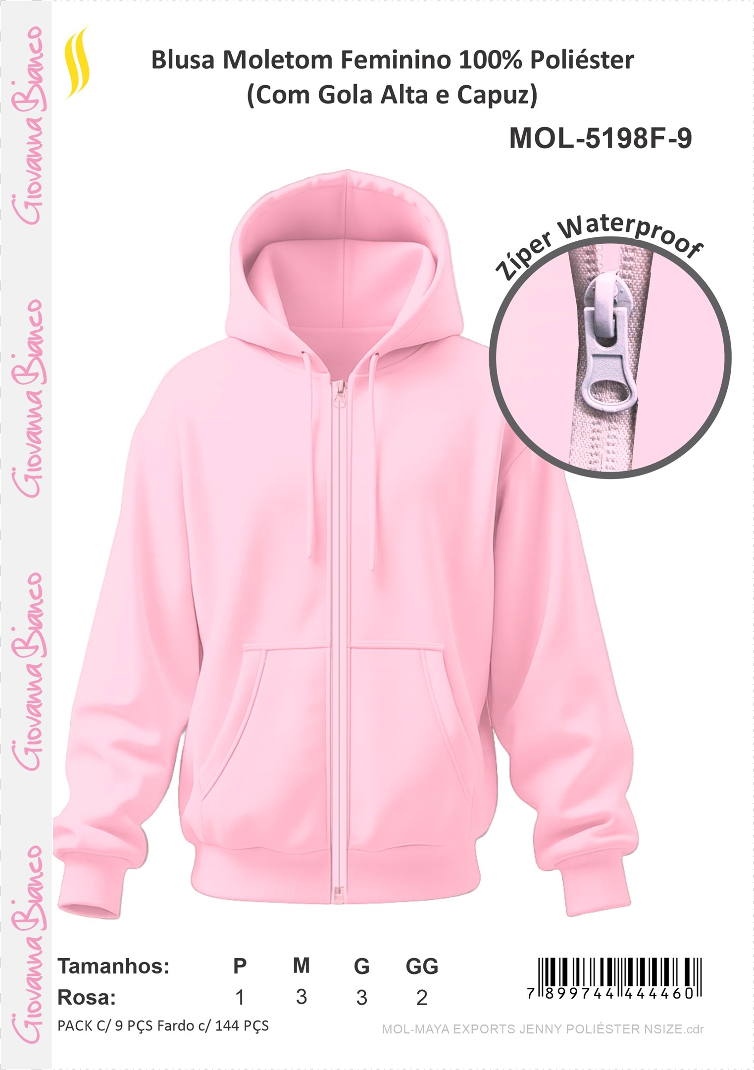 MOLETOM FEM 100%POL GOLA ALTA C/CAPUZ ROSA