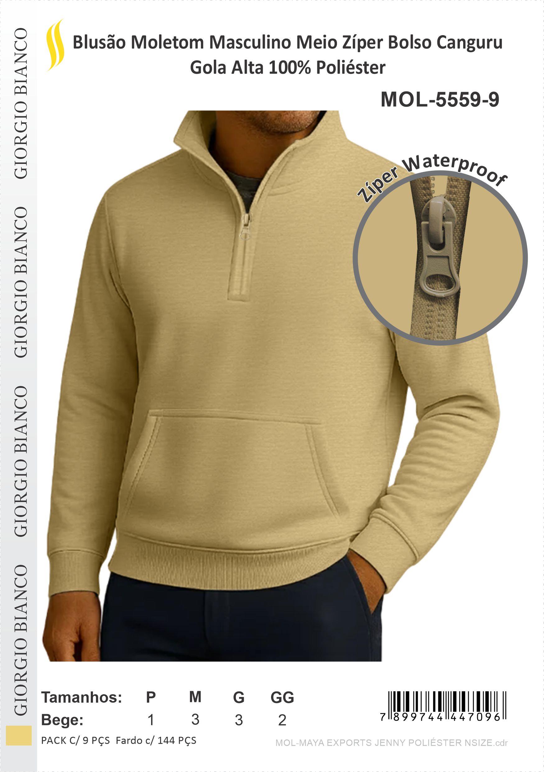 MOLETOM MASC 100%POL CANGURU GOLA ALTA M. ZIPER BEGE