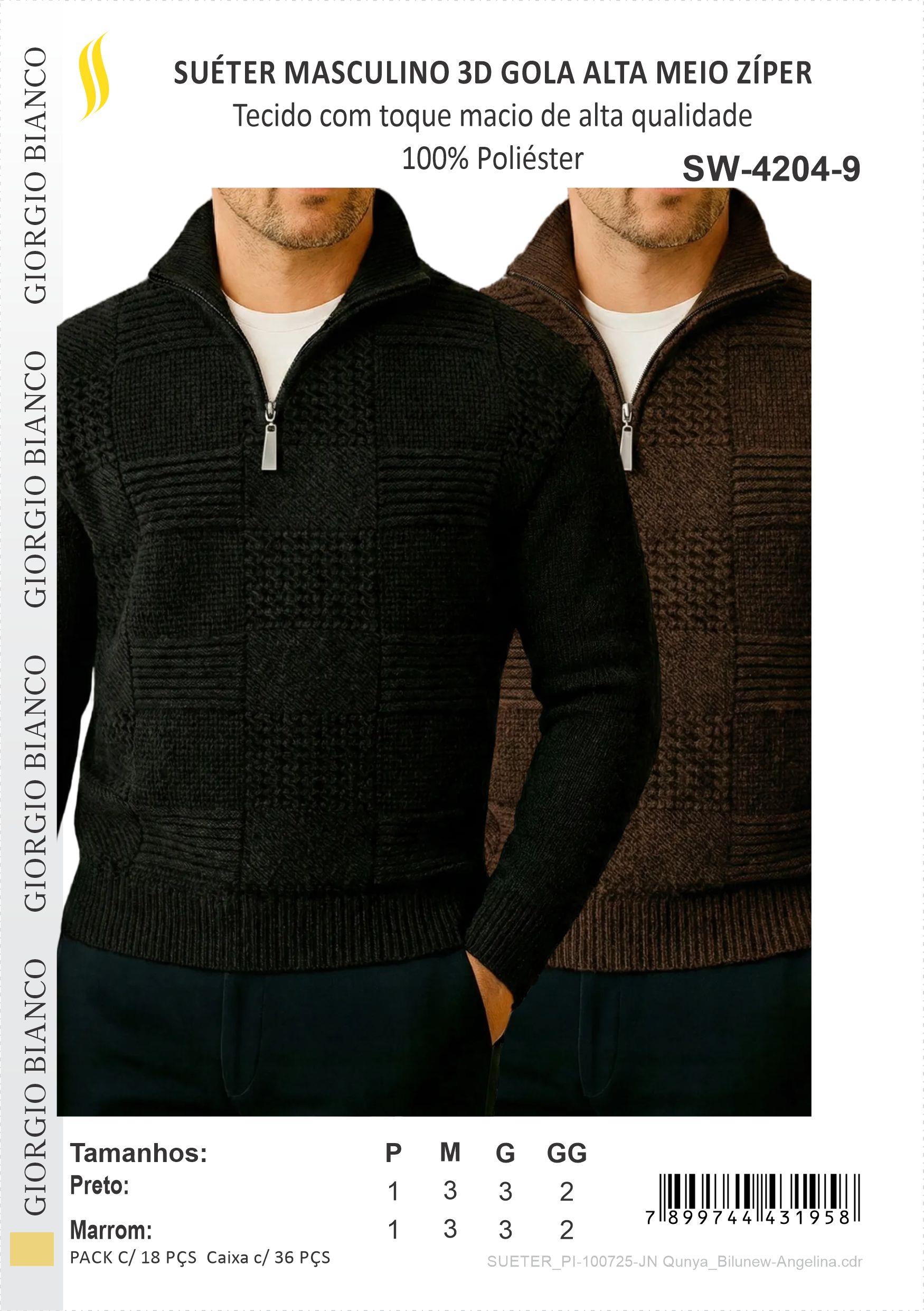 SUETER MASC 100%POL CASUAL 3D MEIO ZIPER PTO/MARROM